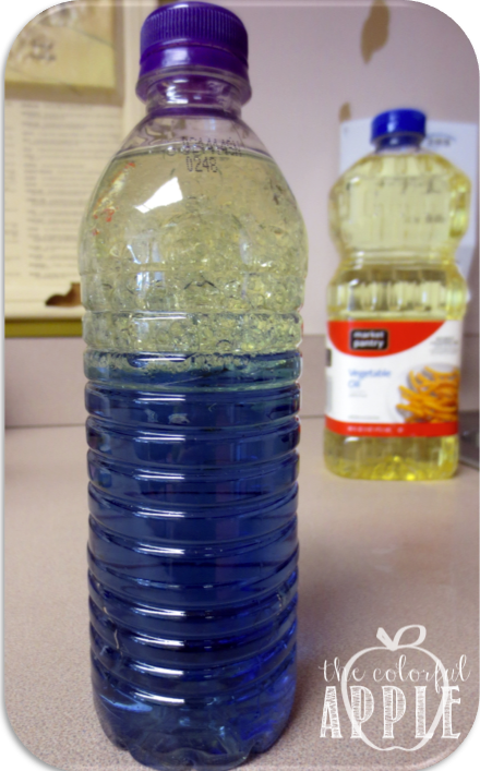 The students then move the water bottle around as the bubbles move around. They are fascinated by the water and oil staying separate.