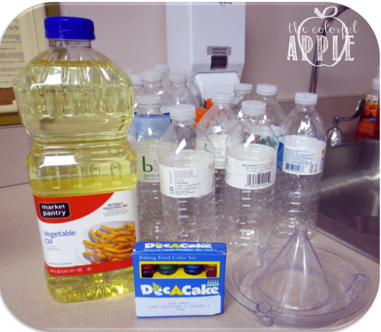 I had each student bring in a water bottle. You also need vegetable oil (I needed 3 bottles for a class of 23 students), food coloring, a funnel and water.