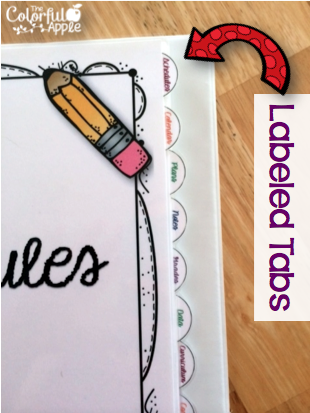 My labels include: schedules, calendar, plans, notes, grades, data, curriculum, and contacts. In the past, I have had separate binders for each of these. This year, I am trying to keep everything together so that I have it all at my fingertips when I need it. This past year, I’ve found myself running back to my classroom during meetings because I forgot something.