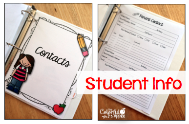 At the end, I made a parent contacts section. I have two cards per page and will copy these back to back as well. It has student name and birthday, as well as parent phone numbers and emails. At the bottom, I made a log for when I contact the parent.