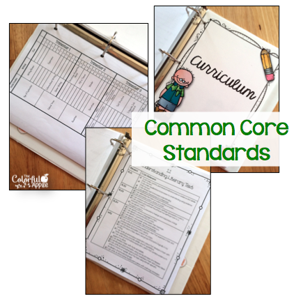 I also wanted to have our curriculum and the CCSS at my fingertips. I typed up an outline of our year for the subjects that I am teaching (although it will probably change). I also added in “I Can” statements to follow our curriculum.